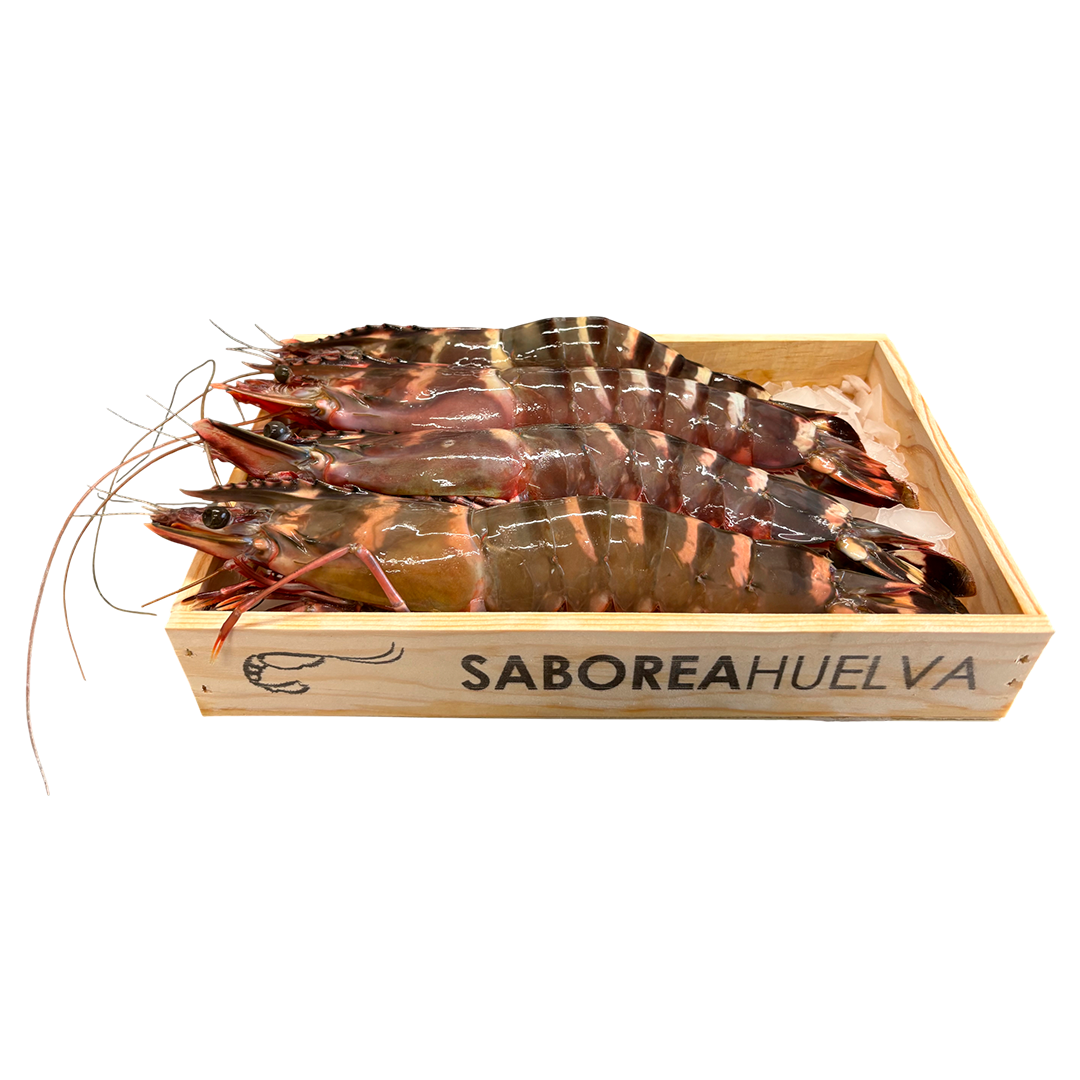 El Langostino Jumbo (Penaeus monodon) también llamado Camarón tigre, es un crustáceo decápodo marino salvaje de gran tamaño. Su llamativo aspecto, coloración y tamaño hace que sea una especie muy reconocida en la alta cocina.